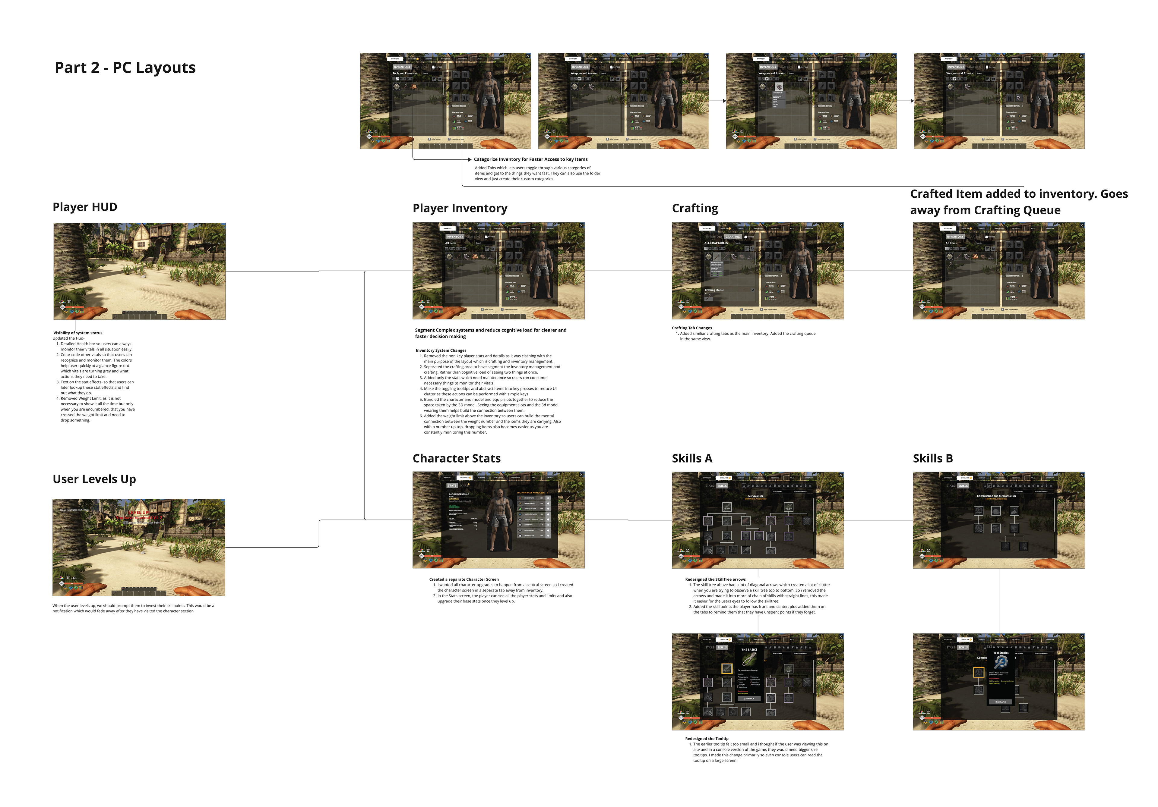 I analyzed Studio Wildcard's prototype HUD and Inventory screens using Usability Heuristics, identifying key user pain points.