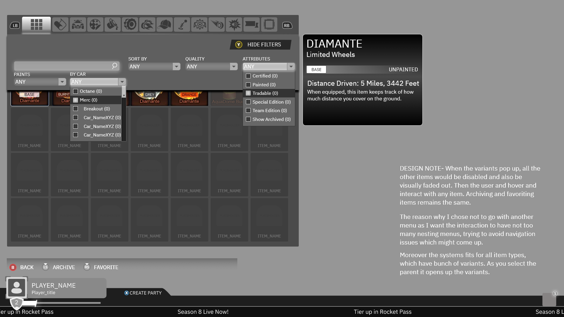 Delivered an end-to-end redesign of Rocket League’s Garage to streamline item browsing, loadout creation, and customization flows. Focused on reducing cognitive load across large inventories with clearer hierarchy, faster filtering, and predictable presets—balancing clarity, style, and performance. Produced high-fidelity prototypes, specs, and motion guidance to align design intent with engineering feasibility.